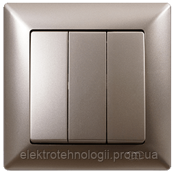 Вимикач потрійний GUNSAN VISAGE золото ексклюзивний продукт на ринку електроісталяційних виробів. Серія VISAGE розроблялася провідними дизайнерами та інженерами для смаків і потреб сучасного динамічного світу. За конкурентної ціни на українському ринку вимикач виділяє передову якість, що не поступається європейським стандартам. Як відомо під час увімкнення струм, проходячи через контакти вимикача, може досягати температури 750 градусів, тому для довгої безпечної роботи механізм вимикача виробляється з пластику з вогнетривкістю до 850 градусів. Чіткі лінії рамки вимикача збережуть свій привабливий вигляд тривалий час про це також подбав GUNSAN. Вимикач GUNSAN VISAGE — чудовий вибір для людей, які йдуть у ногу з часом і цінують безвідмовну роботу приладів, що оточують їх.